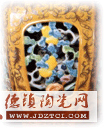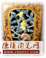 這件作品通體施紫金釉,在口足部施金釉,包括鏤空都在表明仿金屬工藝效果。紋飾中西合壁,雙鉤西番蓮,鏤空靈芝、佛手、壽桃紋.由此可以看出當(dāng)時(shí)中國陶瓷所受西方文化的影響。