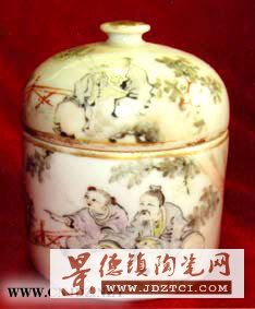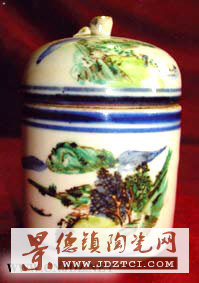 民國筒式套杯,高11厘米、圍23厘米,圓蓋桃鈕,套身繪青花粉彩山水圖,一側(cè)及蓋以行草書寫“可以清心”四字。彩頭、畫技均不佳,這種被稱為“笨拙粉彩” 是用一種劣料 的技法,民國時(shí)期景德鎮(zhèn)民窯多用于繪畫中下等瓷器。它與以上光緒兩品是無法媲美的,錄之供初入藏道朋友們參考而已。