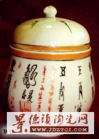 民國鼓式溫酒杯,高12厘米、圍26厘米,圈足、圓蓋、菱形紐。外套以紅墨彩書寫多體文字,繪圖印吉語“百歲多!,一側(cè)書“博古通今”四字,落款江西出品。