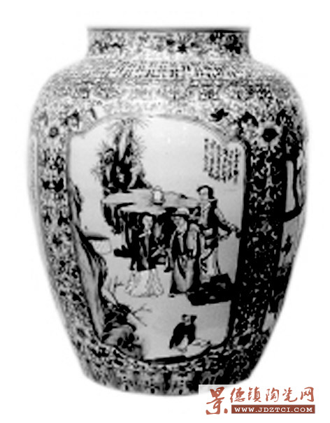 五彩瓷有兩種,一種是青花五彩,一種是純釉上五彩。青花五彩瓷是先在釉下用青花描畫出所繪圖案的藍(lán)彩部分,罩釉燒成,然后再在其余部分按圖案要求繪彩,再放入爐中進(jìn)行二次燒制,這樣一件青花五彩瓷器就算燒成了。這個壇子的繪畫和畫面以外的青花紋飾部分即是。嘉靖、萬歷時期五彩瓷比較多見。嘉靖至明末清初,民窯開始大量生產(chǎn)五彩瓷器。民窯五彩青花作品的圖案一般說來比官窯的要豐富,有神獸、花木奇石、人物山水等,生活氣息比較濃厚。其色彩主要是紅、綠、藍(lán)、黃,這四種顏色在這只瓷壇的畫面上搭配得恰到好處。