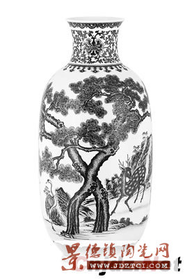 這件青花鹿鶴圖燈籠尊,也正是清乾隆時期的珍品。此器因形似燈籠而得名,吉祥紋飾,高53厘米,口徑13厘米,足徑15厘米。尊口微撇,筒式腹,上下漸收,圈足。青花紋飾,口沿下和肩部各飾如意云頭紋,頸飾纏枝牡丹紋,腹繪松樹、仙鶴與梅花鹿,點(diǎn)綴以山石及花草,近足處飾變形蓮瓣紋,足墻飾回紋。以鹿諧“六”音,鶴諧“合”音,既有“松鶴延年”的美意,又有“六合同春”的祝愿。