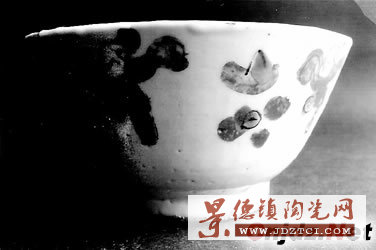 工藝:修胎粗疏隨便,圈足留有粘砂;底足有明顯的火石紅,并有放射狀的跳刀痕。
