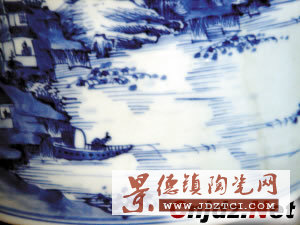 仔細(xì)觀察可見仿制品的紋飾散亂,而且畫工甚為粗糙。真品就完全不同,如“康熙青花山水紋筆筒”,繪畫明顯有著“清初四王”(指四大王姓的書畫名家王原祁、王時(shí)敏、王鑒、王翚)的筆意(這是康熙晚期山水人物青花特點(diǎn)之一),而仿品看不出章法。從局部對(duì)比,新仿青花山水紋筆筒的江水不見任何紋路,只是混沌一片;民國仿康熙山水紋筆筒的江水稍有紋路,但仍是一片模糊;而康熙青花山水紋筆筒便明顯可看到清晰的水紋,生動(dòng)有力,畫工之精粗一比較便有明顯結(jié)論。