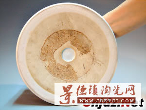 康熙青花山水紋筆筒底部就是一個(gè)典型的例子:1.底部形成俗稱的“壁底”;2.半露胎、中間有釉,在底部形成三圈,中間一圈沒釉;3.底部在燒制時(shí)因?yàn)楦邷厥芾涫湛s而形成“桔皮棕眼”。