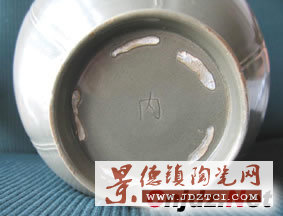 本件藏品是一件五代越窯瓜棱云紋雙系梅瓶,瓶高31厘米。梅瓶是古代的儲(chǔ)酒器,釉色為典型的艾青色,通體施釉,圈足支燒,底部陰刻“內(nèi)”字(見(jiàn)圖),可見(jiàn)這件作品是當(dāng)時(shí)供“內(nèi)府”使用的官窯器。整件梅瓶刻有六條瓜棱線,并在瓶體上以本色釉劃刻六朵飄帶立云紋,瓶肩部塑二圓孔,便于穿繩系帶,瓶口外卷,亭亭玉立,美不勝收。五代梅瓶與后世梅瓶稍有不同的是口頸稍長(zhǎng)、肩腹較寬,并帶有雙系,這是梅瓶初創(chuàng)時(shí)期的特征,不過(guò)那時(shí)這種作為酒具的窯器,不稱梅瓶,而叫酒經(jīng)、經(jīng)瓶,至晚清“梅瓶”稱謂才出現(xiàn),因其小口僅能容納一枝梅而得名。