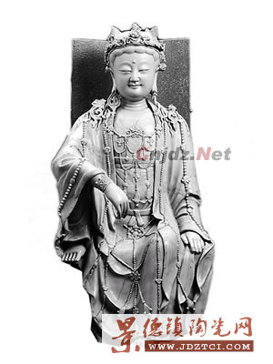 這件瓷塑像高67厘米,1955年出土于西城區(qū)定阜大街西口。菩薩像頭戴寶冠,寶冠上有小化佛,已殘。額頭寬闊,雙目微閉,端莊慈祥,氣質(zhì)高雅。右腿支起,左腿下垂,右臂放在右膝上,神態(tài)優(yōu)美,這種姿勢(shì)的觀音一般稱(chēng)為水月觀音。觀音上身穿袈裟,下身著長(zhǎng)裙,胸前及衣裙上飾聯(lián)珠瓔珞,手腕戴臂釧,全身裝飾十分繁縟。通體施青白釉,釉色白中泛青,胎質(zhì)潔白細(xì)膩。