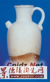 圖為唐代白釉執(zhí)壺,高23.5厘米,口徑5.3厘米,足徑6.5厘米。壺為廣口,短流,餅形平底,柄連接于口,壺身修長,造型規(guī)整,形體豐滿,健實大氣,胎體厚實,胎色灰白,質(zhì)地粗松,白色化妝土和釉不及底,施釉不均勻。略有漏釉現(xiàn)象,釉色乳白,聚釉處呈閃乳黃色。釉層開片不均勻,光澤溫潤,腐蝕痕跡明顯,柄接連處胎骨有窯裂,邊沿處剝釉明顯,下部胎質(zhì)嚴重脫落,另外,在柄身下垂處柄尾上添加一小塊類似紐扣(帽釘)的堆貼裝飾,這可能是古人從服裝上得到啟發(fā),效仿將工體牢牢扣在一起。綜合分析,筆者認為此壺應是唐代邢窯的粗白瓷。