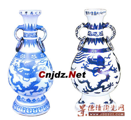 青花瓷器從明初以來一直是景德鎮(zhèn)生產(chǎn)的主流,到萬歷時(shí)期產(chǎn)量大大增加!扒嗷p耳活環(huán)瓶”是明代嘉靖、萬歷時(shí)期的典型器物。