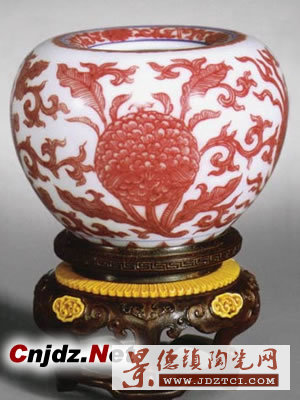 宣德時期的釉里紅瓷也頗為成功了,擺脫了元末那種黑紅、粉紅的晦暗色調(diào)。而且宣德時對銅紅釉的燒造技術掌握得較好,紋飾清晰,色澤鮮艷,被稱為“寶石紅”。
