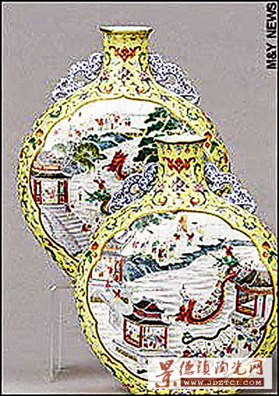 兩個扁瓶高11寸,瓶身畫了河岸景色,一群小孩迎著河上一條龍舟歡呼雀躍。扁瓶黃邊上雕有花紋圖案。其中一個花瓶完好無缺,但另一個的瓶頸有損毀,曾經(jīng)修補過。在專家鑒定其為乾隆年間燒制的真品后,拍賣起價為5,500英鎊(約8.7萬港元),但幾分鐘后叫價已達(dá)35萬英鎊(約554萬港元),至少有2名華人參與競奪,其中一名香港商人的兒子在叫價升至35萬英鎊時退出。