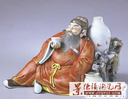 自古以來(lái),鐘馗多以猙獰可怖的面目示人,常手持利劍,捉拿妖魔鬼怪。后來(lái),鐘馗逐漸演變成為迎富、納福的吉祥神人。此瓷像的塑造風(fēng)格與傳統(tǒng)的鐘馗形象不同,更富有生活氣息和人情味,其醉態(tài)使人覺(jué)得和藹可親,詼諧可愛(ài)。彩瓷中的塑像以三彩居多,粉彩少見(jiàn),鐘馗像更為稀有,此件為康熙彩瓷中的珍品。
