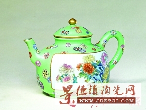 清 乾隆款綠地粉彩開光菊石紋茶壺