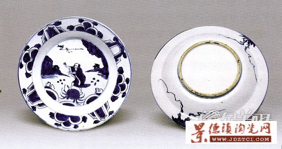 紋飾上的特征:天啟瓷構(gòu)圖的獨(dú)特方式為我們提供了一個(gè)比較直觀的斷代依據(jù)。如從青花羅漢盤(見上圖),可以看到一個(gè)與以往瓷器紋飾構(gòu)圖不同的現(xiàn)象。一般來說,碗盤背面的構(gòu)圖也有天地之分,靠底足為地,口沿為天,人物、風(fēng)景、樹木總是從底向上。而在這件盤子中可以看到一個(gè)天地倒置的現(xiàn)象,草木之根在盤子的口沿,往下伸延。這是天啟瓷構(gòu)圖的特征,其他朝代真是不多見。反之,在盤子的正面也有從口沿向盤心伸延的草木。結(jié)合其他特征,可以為綜合斷代提供一個(gè)比較可靠的依據(jù)。