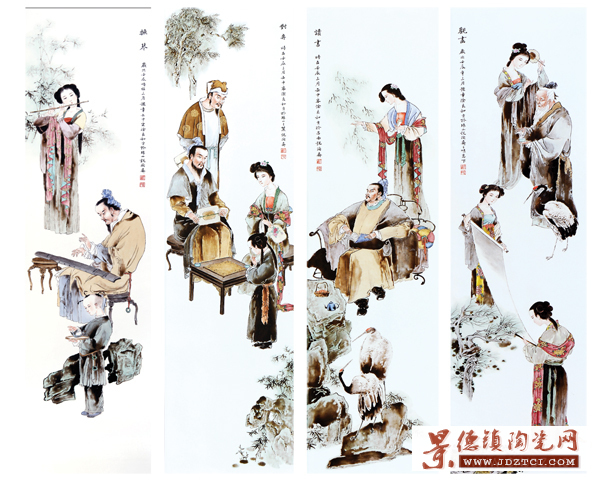 他的人物畫(huà)題材主要是以古典仕女、歷史故事、文人生活等內(nèi)容成為描繪的主題。他的粉彩作品《登高圖》,就是涂良如藝術(shù)心境最完美的詮釋。作品以氣勢(shì)雄渾的山水為背景,畫(huà)風(fēng)高古清奇,線條柔中帶剛。畫(huà)面中人物繁多,但不論遠(yuǎn)近高低,人物神態(tài)各異、面部表情生動(dòng)細(xì)致。整個(gè)畫(huà)面看似隨意而為,實(shí)則法度嚴(yán)謹(jǐn)。涂良如以富有意味的造型、筆墨、色彩、以及豐富的想象力,生動(dòng)地再現(xiàn)了古代歷史人物形象。正因?yàn)橥苛既缬幸环N不流于世俗的安靜心境,才可畫(huà)得出如此沉靜的美,以及那份悠然于世外的的曠達(dá),顯示出他精神上的高貴與誠(chéng)實(shí)。涂良如粉彩作品如《琴棋書(shū)畫(huà)》四條屏、《霓裳羽衣舞》瓷板也是他最具代表性的經(jīng)典之作。畫(huà)面背景雖然簡(jiǎn)略,但留給人廣闊的想象空間,畫(huà)中有畫(huà)極具縱深感。人物神情和心理的描寫(xiě)細(xì)膩,畫(huà)面極具情節(jié)性,墨與色在無(wú)聲碰撞中,幻化出一幅幅逝去的古代人物靈動(dòng)的生活場(chǎng)景。