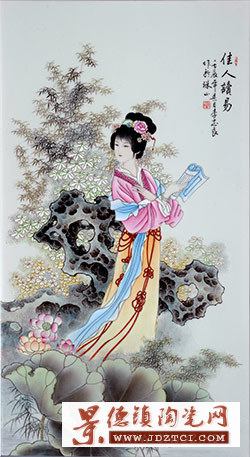 《佳人讀易》粉彩人物瓷板畫(huà)強(qiáng)調(diào)了人物神情,通過(guò)題款及人物服飾的處理等手法,使段與段之間有一種內(nèi)在的聯(lián)系,形成散而不亂、疏密得當(dāng)?shù)挠袡C(jī)整體。圖中人物神態(tài)宛然,所畫(huà)仕女端莊嫻靜,符合封建箴文內(nèi)容,畫(huà)中始終運(yùn)用了勻細(xì)而流動(dòng)的線(xiàn)條,顯示畫(huà)作的韻律之美,訴說(shuō)的人物仿佛有一種很愉悅的情緒在身體里游動(dòng),作品以文人畫(huà)風(fēng)為主導(dǎo),以不俗不套為原則,力求新意。