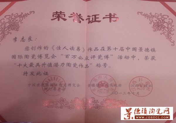 李志良創(chuàng)作的《佳人讀易》作品在第十屆中國(guó)景德鎮(zhèn)國(guó)際陶瓷博覽會(huì)“百萬(wàn)公眾評(píng)瓷博”活動(dòng)中,榮獲“十大最具升值潛力陶瓷作品”稱(chēng)號(hào)