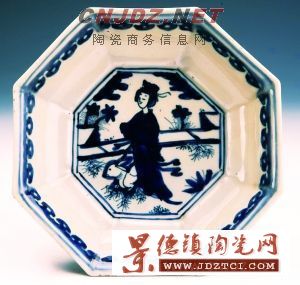 隆慶一朝時間較短,景德鎮(zhèn)窯瓷器遺留傳世的器物并不多,以小件器為主,少見大器,胎、釉較細(xì)膩。青料用回青,呈色穩(wěn)定、純正,藍(lán)中泛紫,但不像嘉靖器般紫得厲害。紋飾與嘉靖朝相近,佛道內(nèi)容較多。多六角、八角等造型。帶年款的器物甚少,官窯器的款識有“大明隆慶年造”和“隆慶年造”兩種,不見“制”字款;民窯器款有“隆慶年造”或“制”四字款;吉語和贊頌語款有“萬福攸同”、“福壽康寧”、“富貴佳器”等。因此,這件帶年款的八角盤雖為民窯器,但也彌足珍貴。
