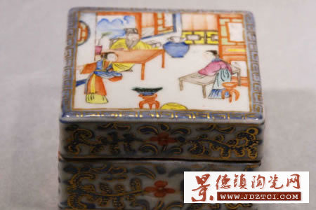 清代的“青花描金粉彩人物故事紋印盒” 整體造型規(guī)整,正面繪有人物場景,周身描金回紋,優(yōu)雅華貴,底部及內(nèi)部均為松石色釉面,整體畫工細(xì)膩,釉色純正,胎質(zhì)一流。