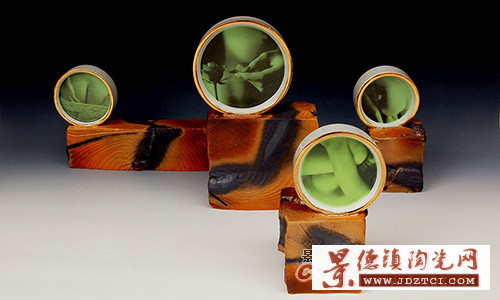 在此之后,他相繼在2007年、2008年創(chuàng)作《電視機——愛語系列》、《手機——愛語系列》、有關(guān)情色題材的陶藝作品,此系列作品造型選取日常生活中電視機、手機造型,源于它們是當今傳播情色文化信息的重要圖像媒介,大量傳遞給我們的東西:名與利的功利價值觀、情與色的裸露彌漫生活觀,瓦解和踐踏人們的傳統(tǒng)倫理道德觀。像《電視機——愛語系列》陶藝作品,吸取當代卡通文化時尚元素,有意識在造型形態(tài)設(shè)計為天真可愛,富有審美時尚情趣,主色調(diào)采用充滿幻想浪漫的果綠色與粉紅色,屏幕內(nèi)主題畫面以人物接吻特寫鏡頭角度,通過卡通插畫表現(xiàn)形式釉上彩繪,邊沿部分搭配鮮艷斑斕蝴蝶,突出主題畫面的情色視覺的感官效應(yīng),營造刺激暖的誘惑氛圍,彌漫赤裸色情的性幻想之意,揭示人性本性的另一面。還有作品《手機——愛語系列》,著力把手機與安全套兩者造型融為一體,轉(zhuǎn)變成充滿情欲與性愛幻想的時尚手機,屏幕畫面內(nèi)釉上彩繪裝飾著擺弄各種色情引誘的女性姿態(tài),諷刺當下社會的情色環(huán)境與人性情欲的貪婪本性現(xiàn)象。