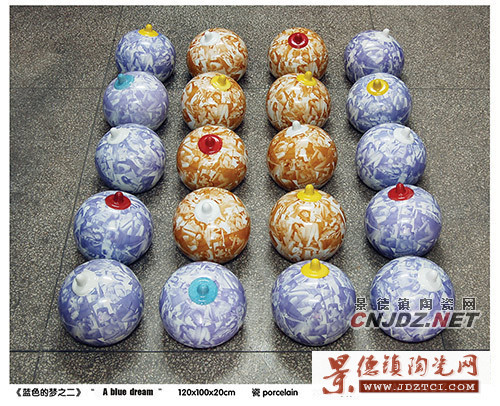 袁樂輝的第一件獲獎作品《藍色的夢》,以女性飽滿圓潤的乳房為造型,并選取無數(shù)張裸露色情的女性照片,采用拼貼形式絲網(wǎng)印制在其造型上面,其想表達的主題定為“欲望、彌漫、憂傷”,此件作品于2007年入選韓國第四屆國際陶藝雙年展,增加他對有關(guān)情色類陶藝創(chuàng)作的自信與延續(xù)。
