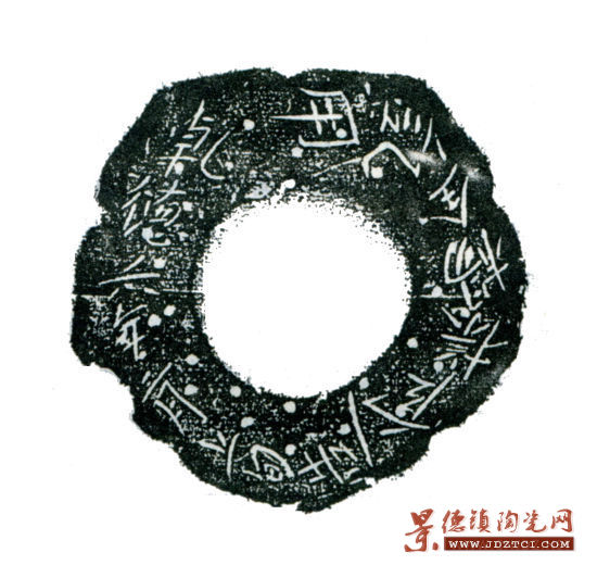 2.1993年在邛崍市邛窯唐代民居建筑遺址出土一件蓮花紋盤印模(內(nèi)模)。印模直徑13厘米,厚3.3厘米。印模背面有深淺不一的不規(guī)則圓形氣孔,應是燒制時的防裂氣孔。印模正面的壁為五瓣花口,模面中心雕刻排列規(guī)整的蓮子(共40粒),蓮子外刻一圈凹弦紋,弦紋外刻一周花蕊(圖1)。印模背面陰刻“乾德六年二月上旬造官樣,楊全記用”十五字環(huán)讀銘文(圖2)(參見李子軍:《邛崍市發(fā)現(xiàn)紀年銘文印!,《成都文物》1996年第1期)。