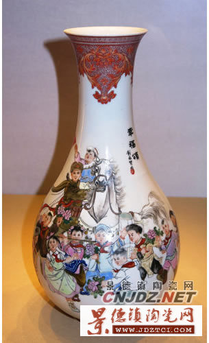這件瓷瓶所繪“幸福頌”圖,描繪了12個身著少數(shù)民族服裝的小朋友,他們載歌載舞,簇?fù)碇?名披著斗篷、拉著戰(zhàn)馬的志愿軍戰(zhàn)士,場面熱烈而壯觀。留白處題“幸福頌”三字,落“彭兆賢作”墨書款,鈐紅彩篆書章“印”字。作品上人物眾多,刻畫生動,色彩豐富,既充分展現(xiàn)了祖國少年兒童對志愿軍戰(zhàn)士的熱愛之情,也從一個側(cè)面反映了全國各族人民珍視幸福生活、熱愛世界和平的美好心愿。