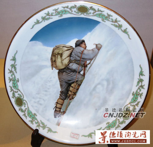 這件瓷盤所繪“雪山科考”圖,以湛藍(lán)的天空和白雪皚皚的山體為背景,描繪了一名戴眼鏡的科考隊員背負(fù)著重重的設(shè)備,匍匐在雪地上,正在認(rèn)真地進行考察記錄的場面。作品以灰白色調(diào)為主,明快清爽,和諧統(tǒng)一,人物刻畫細(xì)膩,造型準(zhǔn)確寫實,遠(yuǎn)觀與照片毫無二致,形象地展示出雪山科考隊員不畏嚴(yán)寒、科學(xué)嚴(yán)謹(jǐn)?shù)墓ぷ骶瘛?/P>