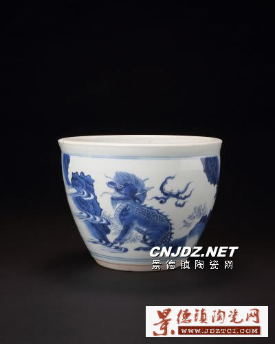 明崇禎,青花麒麟大象紋卷缸,H:15.5cm。缸口外敞,平沿,深腹,腹下漸收斂,平底,近足處露胎,砂底無款,修胎平整無跳刀痕。品相完整,釉色白凈,砂底細(xì)膩白中泛紅,撫之溫潤(rùn)如玉為歲月沉著之包漿,胎與釉銜接處火石紅明顯,只見胎體便知崇禎之典型。肥厚白釉之下透出上等浙青料之翠藍(lán)色,隔著中間的釉面氣泡小而均勻,似蒙上一層淺薄的霧氣,柔麗溫和。紋飾描繪山間麒麟大象,雙勾外輪廓線填以青花暈染,顏色深淺有分,線條流暢自然,麒麟大象憨態(tài)可掬,一幅可愛靈獸的畫面。