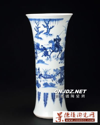 明崇禎,青花千里走單騎紋觚,H:44cm。撇口,長(zhǎng)頸,撇足,細(xì)砂平底;餍透叽,胎體堅(jiān)密,釉面白中微泛青,細(xì)潤均凈,青花色澤鮮艷,層次分明,山石云紋與人物刻畫生動(dòng)。流暢的行云紋、飄逸的柳樹枝條、暗刻弦紋為崇禎時(shí)代的特征;男沃苼碓从谇嚆~孤,是盛酒器皿,隨時(shí)代的轉(zhuǎn)變花觚由實(shí)用器變?yōu)殛愒O(shè)器,也是佛前供器之一。經(jīng)嘉靖、萬歷朝的發(fā)展,花觚造型多樣化,流行民間故事、花鳥動(dòng)物等題材。