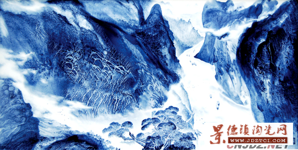 胡昭軍的作品以山水題材為主,云霧山川、古亭高士、極具文人畫的意趣。青花流淌形成的畫面,有著許多人力無(wú)法低達(dá)的境界。