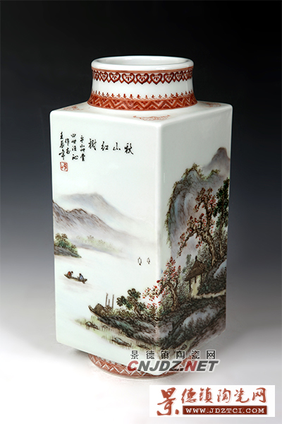 縱觀幾代“汪派山水”,不難發(fā)現(xiàn)“汪派山水”繼承了中國傳統(tǒng)文人畫中的品位。講究融詩、書、畫于一體,由作者本人書畫并題。作品意境深遠(yuǎn),色彩淡雅,以景傳情,具有強(qiáng)烈的感染力。因此能表現(xiàn)作者主觀思想志趣與審美觀念,突出個人的創(chuàng)作風(fēng)格與個性。也能體現(xiàn)作者的文化藝術(shù)修養(yǎng)和哲學(xué)思想。山水創(chuàng)作將國畫的皴、擦、暈、染等技法融入瓷畫創(chuàng)作,通過陶瓷這個載體表現(xiàn)個人思想情感和審美旨趣,這完全有別于傳統(tǒng)山水的勾線填色和富麗重彩,而顯得清雅脫俗,個性風(fēng)格突出,使作品有很高的文化內(nèi)涵和藝術(shù)價(jià)值,這是以往景德鎮(zhèn)的傳統(tǒng)彩繪藝人所不具有的。在造型藝術(shù)方面,適應(yīng)陶瓷花瓶等圓形器皿彎曲轉(zhuǎn)折的特點(diǎn),巧妙布局,別具匠心地始創(chuàng)難度很高的通景山水,使陶瓷作品在各個角度看都是完整的畫面,又可以連續(xù)轉(zhuǎn)動觀賞,將國畫山水長卷的神韻融入其中,而陶瓷造型特色,又使之具有首尾相連,循環(huán)往復(fù)的動態(tài)美。在設(shè)色方面,既不同于古彩的單調(diào)、刻板、艷俗,又比淺絳彩豐富,富于表現(xiàn)力。