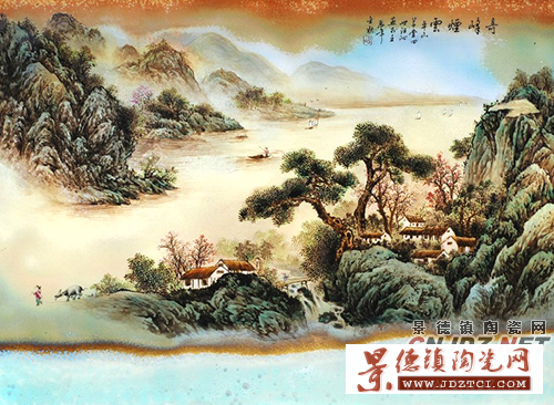 汪野亭以青綠山水影響巨大。以國畫融入陶瓷中,這在山水題材上難度更大,因?yàn)橛粤显?a href="http://m.iv978.cn" target="_blank">陶瓷繪畫中不像水墨在宣紙上那樣容易揮寫皴染,這就限制了瓷上山水的表現(xiàn)形式。汪野亭先生開拓創(chuàng)新,別開生面地將國畫山水繪畫的神韻融入陶瓷創(chuàng)作中,使瓷山水達(dá)到一個新的高度。在結(jié)合的過程中,不僅對景德鎮(zhèn)傳統(tǒng)的彩繪工藝進(jìn)行了一系列的改革,而且也對傳統(tǒng)“文人畫”作了一些內(nèi)容和形式上的調(diào)整。