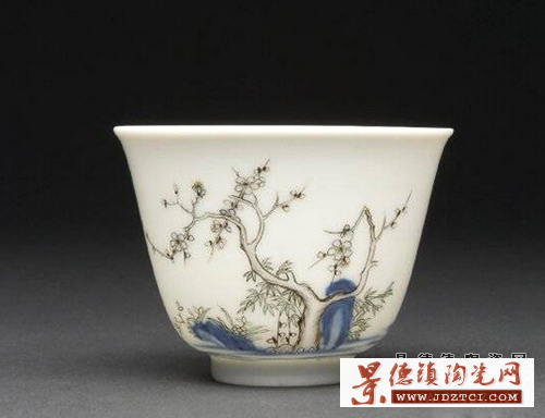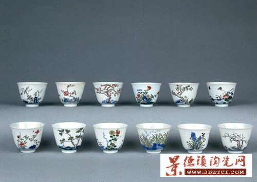 “十二月花卉紋杯”12件為一套,其外形特點為:撇口、深腹、淺圈足、胎體輕薄、器型精巧絕倫,造型規(guī)整優(yōu)美,胎質(zhì)乳白、器薄如紙、晶瑩剔透;其外壁分別用一年十二個月中不同的花卉來裝飾,并配以相應的詩句?滴跏ɑ鼙系幕ɑ芤运苫ㄩ_始,然后以此為迎春花、桃花、牡丹花、石榴花、荷花、蘭花、桂花、菊花、芙蓉花、月季花和梅花,一杯一花,腹壁一面繪畫,另一面題詩,詩句出自唐詩。每只杯上繪一種應時花卉,指代歷史上的著名女性,并題上相應的詩句,慣稱“十二月花神杯”。規(guī)格:口徑6.7厘米,足徑2.8厘米,高4.9厘米。