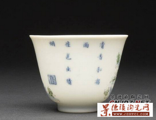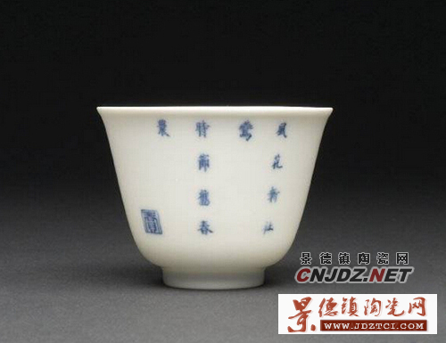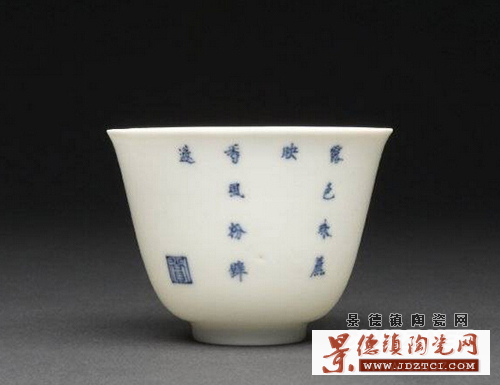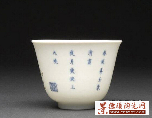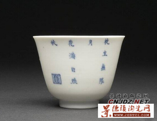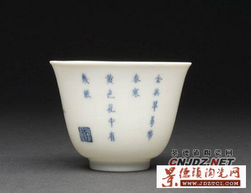 康熙對歷代的瓷器很有研究十分欣賞,康熙十九年下令景德鎮(zhèn)恢復御窯廠,研制新風格的各種瓷器。康熙二十五年景德鎮(zhèn)御窯廠為宮廷燒制一套生活用瓷——“十二花卉紋杯”,第一次把“詩、書、畫、印”在同一器皿上并用,每只杯上繪一種應時花卉,指代歷史上的著名女性,并題上相應的詩句,慣稱“十二月花神杯”。康熙皇帝十分喜愛,幾次南巡都帶在身邊,他不僅喜歡花神杯瓷器的工藝更喜歡花卉配唐詩的文化意境。