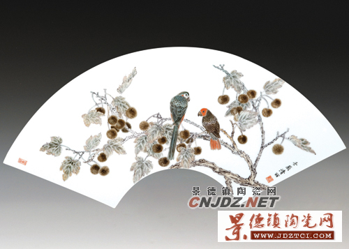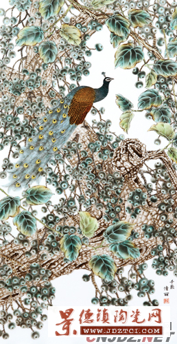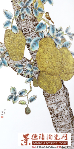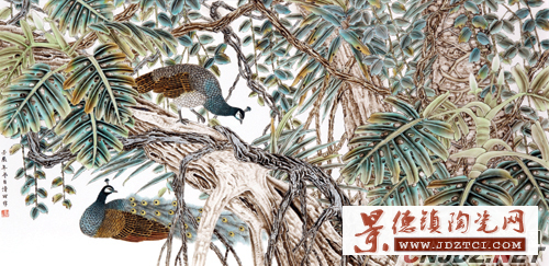觀清麗的粉彩陶瓷花鳥(niǎo)是一種視覺(jué)享受。她筆下的花鳥(niǎo)世界,色澤粉潤(rùn)柔和,細(xì)膩豐富。既見(jiàn)夏花之爛漫,亦有冬景之蕭瑟,傳情達(dá)意,不止乎于形。粉彩瓷板畫(huà)《雨林之樂(lè)》,清朗的天空下,繁茂的熱帶雨林生機(jī)勃然,仿佛置身其中,似可聆聽(tīng)到禽鳥(niǎo)的鳴唱,“絲管啁啾空翠來(lái)”,這自然的美景,又何嘗不是一曲生命的樂(lè)章。畫(huà)面中藤蔓曲折環(huán)繞,脈絡(luò)細(xì)節(jié)纖毫畢現(xiàn),而巧妙的穿插安排卻使畫(huà)面呼吸暢通、節(jié)奏明朗不擁擠拖沓,氣度渾然而細(xì)節(jié)處見(jiàn)娟秀!抖翢o(wú)聲》頗得宋人雪景翎毛的法度意趣,又參以明代花鳥(niǎo)之恢宏景象,遠(yuǎn)景渲淡,空蒙彌漫,近景雙鉤,細(xì)致入微,細(xì)節(jié)處一絲不茍,富有感染力。《秋風(fēng)掠影》表現(xiàn)風(fēng)起的瞬間景象,造型生動(dòng),物象相互呼應(yīng),富有動(dòng)感卻不失井然之序,色澤淡雅明快。《山花爛漫》截取折枝入畫(huà),構(gòu)圖老到,簡(jiǎn)中見(jiàn)繁,活潑靈動(dòng)。她的粉彩主要探索點(diǎn)染、洗染、撞色等技法的運(yùn)用,色墨交融,清新明麗,富有韻味。