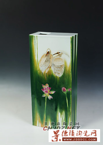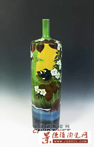 景德鎮(zhèn)的顏色釉瓷器歷史悠久、品種繁多,色彩繽紛,馳名中外。馮雪迎勤于陶瓷創(chuàng)作,精于器型的塑造,并專于色釉綜合裝飾的研究和創(chuàng)作。色釉綜合裝飾在技術(shù)、手法上的要求較高,馮雪迎的作品主次分明,品種繁多且變幻莫測(cè),其工藝性很強(qiáng)的設(shè)計(jì)方法大都要求把握住裝飾的總體效果,不必拘泥于細(xì)小局部,同時(shí)也要運(yùn)用一些半流動(dòng)或不流動(dòng)的色釉畫底,進(jìn)行局部刻畫,使其渾然一體,既流動(dòng)性好、自然,又不至面貌全非,在色釉的分布搭配上也照顧了器型和釉料的特點(diǎn)。要做好色釉綜合裝飾不單是要具備一定的藝術(shù)修養(yǎng),更重要的是熟透工藝,用顏色釉裝飾陶瓷才能得心應(yīng)手。她充分的利用顏色釉的自然天成,并巧妙構(gòu)思,使色釉斗彩作品渾然天成,作品即可美化人們的生活,又能夠陶冶人們的情操。