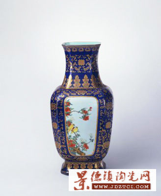 霽藍(lán)釉描金地開光粉彩花鳥紋方瓶,清乾隆,現(xiàn)藏于北京故宮博物院霽藍(lán)釉描金地開光粉彩花鳥紋方瓶,清乾隆,現(xiàn)藏于北京故宮博物院