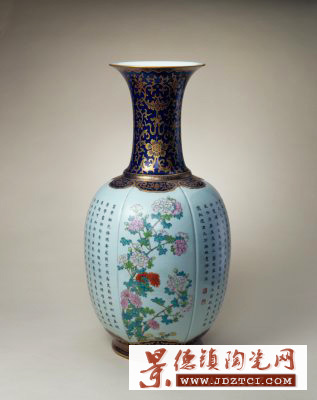 霽藍(lán)地描金粉彩詩句花卉紋大瓶,清乾隆,現(xiàn)藏于北京故宮博物院霽藍(lán)地描金粉彩詩句花卉紋大瓶,清乾隆,現(xiàn)藏于北京故宮博物院