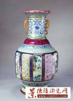 各種釉彩大瓶,洗口,長頸,長圓腹,圈足外撇。頸兩側(cè)各置一螭耳。器身自上而下裝飾的釉、彩達(dá)15層之多。所使用的釉上彩裝飾品種有金彩、琺瑯彩、粉彩等;釉下彩裝飾品種有青花;還有釉上彩與釉下彩相結(jié)合的斗彩。所使用的釉有仿哥釉、松石綠釉、窯變釉、粉青釉、霽藍(lán)釉、仿汝釉、仿官釉、醬釉等。主題紋飾在瓶的腹部,為霽藍(lán)釉描金開光粉彩吉祥圖案。