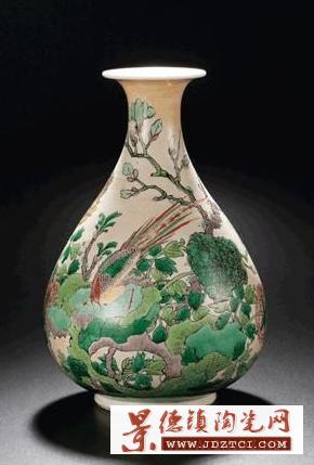 此件玉壺春瓶撇口,短頸,頸以下漸向外闊,至近底處內(nèi)斂,圈足微外撇。其腹部渾圓大氣,身形挺拔壯碩,予人典雅尊貴之感,有明顯繼承明末玉壺春瓶式 的痕跡,線條圓潤敦實(shí),少了一絲秀雅,多了一份雄渾,瓶身通體上米色釉,上釉旋轉(zhuǎn)痕跡明顯,主體紋飾于米黃色釉上以五彩繪洞石錦雞玉蘭牡丹紋,寓意錦上添花,玉堂富貴,所繪紋飾工細(xì),全部圖案均以墨線描邊,然后在輪廓內(nèi)填彩。紋飾圖案繁復(fù)工整,于錦俏熱鬧之余,尚有一絲文人畫氣息,靈動(dòng)鮮活,惹人喜愛,而此瓶之紋飾與釉彩裝飾,則相對(duì)特殊,色地加彩在康熙之前的五彩器物中比較少見,明代曾有罐、爐一類以紅綠彩為地的彩繪器,但裝飾手法較為單一,所用顏色也相對(duì)簡單,而此件器物則安排了綿密繁復(fù)的圖案及畫面,雉雞紋的形象源自中國特有的鳥類紅腹錦雞,其翎羽華麗,色彩鮮艷,因極具裝飾效果,所以古人常以之入 畫,又因?yàn)槠渖嗜A麗,又有錦繡繁華之意,配合其周邊所繪的竹石牡丹及玉蘭花卉,寓意吉祥,此圖案為康熙朝經(jīng)典裝飾紋樣,在青花及青花五彩器物中反復(fù)出現(xiàn),可資參閱的例子也較多,后世有所繼承。在米釉上繪五彩紋飾為康熙朝新創(chuàng)裝飾方法,殊為罕見,即便是康熙本朝器物,也不為多見,因與之相類者寥寥,所以此風(fēng)格的玉壺春瓶于拍場更是十分稀見,目前已知北京故宮博物院有一件清宮舊藏的米黃釉五彩玉壺春與之風(fēng)格相同,但紋飾有所差別,高度略高于本件,且瓶底同 樣無款。