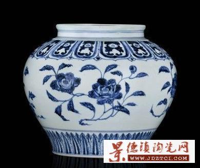 此罐是明代瓷器裝飾風(fēng)格的典范。一改元青花的繁密華縟而代之以疏朗清秀,纏枝花卉于蓮瓣紋予人一種高雅大方的美感。紋飾與優(yōu)美的罐體相襯,愈顯宮廷 奢華之氣,展示了景德鎮(zhèn)官窯匠師非凡的藝術(shù)才華。整器用進(jìn)口的“蘇麻離青”料繪制,筆法活潑流暢,線條粗細(xì)并用,彩料濃淡兼施。且不論著色深淺,紋飾效果 皆極為絢麗鮮艷、清新明快。在線條的紋理中布滿鈷鐵的結(jié)晶斑點(diǎn),呈星狀點(diǎn)滴暈散,彩料濃重處則凝聚成黑青色結(jié)晶斑。正因?yàn)榍嗔洗艘惶匦裕町嬅娓挥谒?般揮灑淋漓、蒼翠欲滴的意趣。所形成的此種藝術(shù)效果,“蘇麻離青”料固然是一方面原因,但更主要的還是匠師自身所具備的藝術(shù)修養(yǎng)與繪制技巧。每組花卉的形 態(tài)均系以極富中國畫傳統(tǒng)筆墨意韻之勾、勒、點(diǎn)、染等技法繪就,畫筆細(xì)膩傳神,表現(xiàn)出枝葉的翻轉(zhuǎn)扭曲、偃仰起伏之態(tài);花、枝、葉間的疏密聚散同樣是借鑒了國 畫的結(jié)構(gòu)布局,得其法度,極富寫實(shí)效果,充分體現(xiàn)了匠師扎實(shí)深厚的筆墨功底;疏密有致的鋪排在視覺上亦形成了張弛有度的藝術(shù)效果。