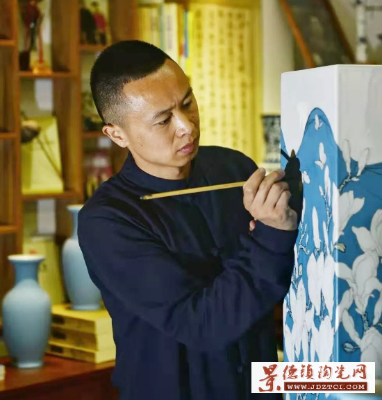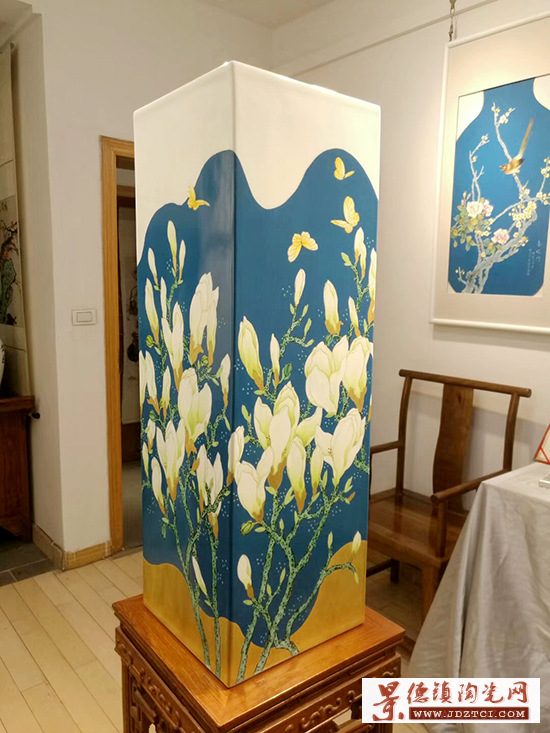 作品“入神、入心、入言”,以五行、生態(tài)、中國夢為內(nèi)核,在傳統(tǒng)元素中創(chuàng)新方法,高白泥制胎,綜合運用古彩、粉彩等工藝技法繪制。潔白的玉蘭花冠幽靜典雅,花蕊以極富質(zhì)感的寶石紅點染,玉蘭花萼和花托以及鑲器下部的沙丘印象都用24K純金描繪,使畫面更加富麗大氣。畫面中古綠、蘋果綠、天藍等溫和色彩構(gòu)成大自然中的生態(tài)景象,在色彩的層次感方面處理得非常細膩而微妙,作品問世后,各界反響強烈。