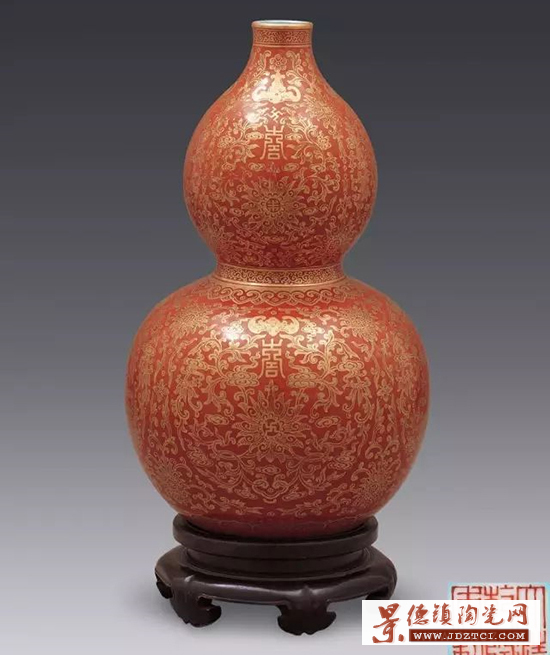 珊瑚紅也是一種低溫鐵紅釉,始于康熙,盛于雍、乾兩朝。燒成后釉色均勻、光潤(rùn),能與天然珊瑚媲美,故名“珊瑚紅”。乾隆時(shí)多在珊瑚紅上描金,或用它來(lái)裝飾器耳。但仍以珊瑚紅器物為貴。