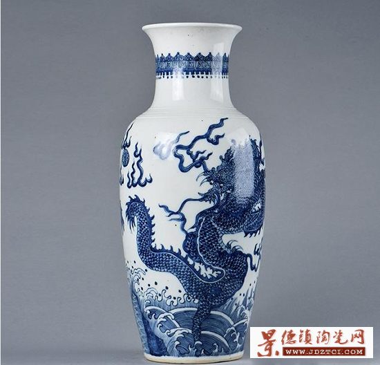 青花雙龍戲珠棒槌瓶,器形壯碩,通體青花裝飾,腹部青花通繪雙龍戲珠,四周裝飾“壬”字云紋及“山”形火焰紋,近足繪海水紋,畫工流暢遒麗,大開大合,盡顯皇家氣象,具有典型的青花特征,青花發(fā)色靚麗藍中泛紫,呈現(xiàn)青金石色,為特有的“回青”料發(fā)色。紋飾流暢,布局疏密有致,其畫法傳承了經(jīng)典,采用點畫的方式畫出鐵銹斑的模樣,瓷化程度很高,用手指輕叩,發(fā)出清脆的金屬聲音。修胎一絲不茍,看不見旋削痕。