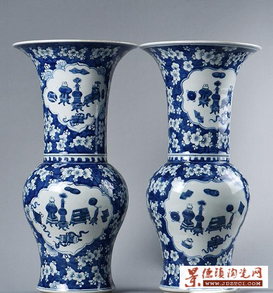 開窗繪博古紋青花鳳尾尊,該器造型優(yōu)美,大口外撇,長頸漸收,鼓腹下斂,足底外傾,二層臺圈足。鳳尾尊的大口向外張開呈鳳尾狀而得名。外壁繪青花繪冰梅紋,開窗繪制博古紋,造型挺拔端正,足端露胎處可見胎質潔白細膩,緊實致密。釉面光潔瑩潤,滿繪百花圖紋,頸部和腹部分別對稱開窗繪制博古紋,相得益彰。