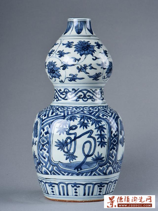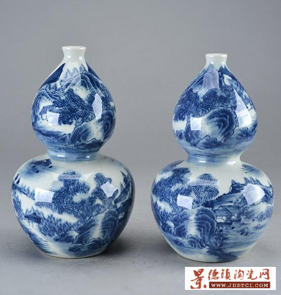 此瓶呈葫蘆狀,主題以青花繪山河之景。山石樹木皴染自如。此瓶造型端莊,色彩明快,繪製精細,保存完好。