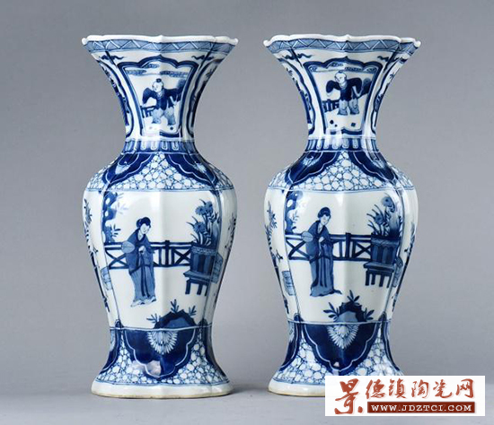 青花瓜楞蓮口賞瓶一對,瓜棱形賞瓶,器身呈六棱花瓣形狀,器口底如蓮葉典雅別致。形制端正,釉面瑩潤。腹部主體飾美人賞菊紋,兩側分飾博古圖紋。頸部會童子游戲,構圖層次豐富,繪畫技法嫻熟,整器繪畫精美細膩,青花發(fā)色鮮艷亮麗,藍中泛紫,做工精細,白釉底。胎質堅實厚重,釉面滋潤凝厚,施釉不及底,細砂底,外壁青花紋飾繁復中不失雅致大氣,置于廳堂之中,彰顯氣派。