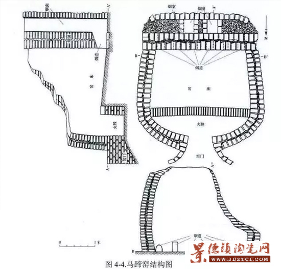 從圖中我們看出,葫蘆窯主體結(jié)構(gòu)是由前室和后室兩部分組成,這兩室就如同兩個(gè)饅頭窯,整體又是一個(gè)倒地后置煙囪的龍窯。元代末期,葫蘆窯形態(tài)還未擺脫龍窯形態(tài),前后室都非常不明顯,這時(shí)的葫蘆窯可能還是以龍窯為基礎(chǔ),想在龍窯上做些改變。到了明代初期慢慢把窯爐束腰前移,初步把饅頭窯和龍窯進(jìn)行結(jié)合。明代中期窯型已經(jīng)成熟,窯爐葫蘆形制體現(xiàn)的很透徹。所以葫蘆窯的出現(xiàn)是結(jié)合了龍窯和馬蹄窯,并且不斷改進(jìn)的新型窯爐,也是龍窯和馬蹄窯發(fā)展的結(jié)果。