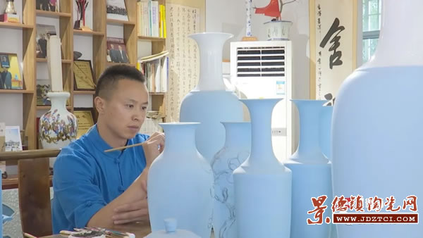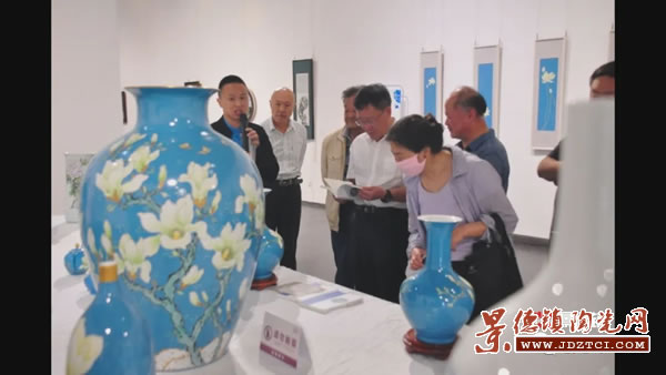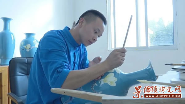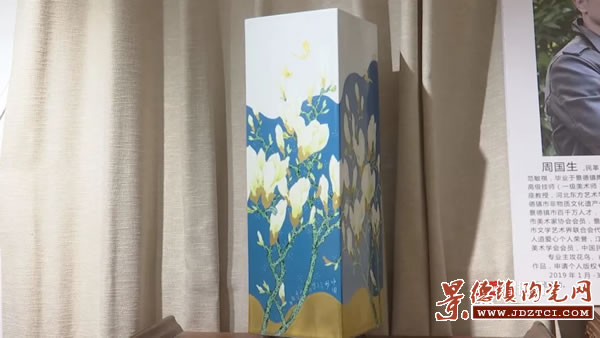 嫻熟的傳統(tǒng)粉彩、古彩工藝,先是寫(xiě)形,再構(gòu)草圖,然后刻畫(huà)深圖,因?yàn)樗{(lán)色的低溫釉有一定的厚度,深圖就需要用針尖刻畫(huà)出圖案的準(zhǔn)確輪廓,之后再刮掉輪廓內(nèi)的底色,進(jìn)行填色。如此復(fù)雜、耗時(shí)的工作日復(fù)一日,無(wú)疑是枯燥乏味的,常人很難堅(jiān)持。但周?chē)?guó)生經(jīng)過(guò)二十余年的傳統(tǒng)學(xué)習(xí),有著扎實(shí)的傳統(tǒng)功底,他深知,既然自己選擇了陶瓷繪畫(huà),選擇了白玉蘭題材,那么就必須堅(jiān)守傳統(tǒng),用傳統(tǒng)的工藝結(jié)合創(chuàng)新,把這條路走出來(lái),創(chuàng)出特色,使作品具有自己鮮明的個(gè)性符號(hào),為此付出再多也是值得的。