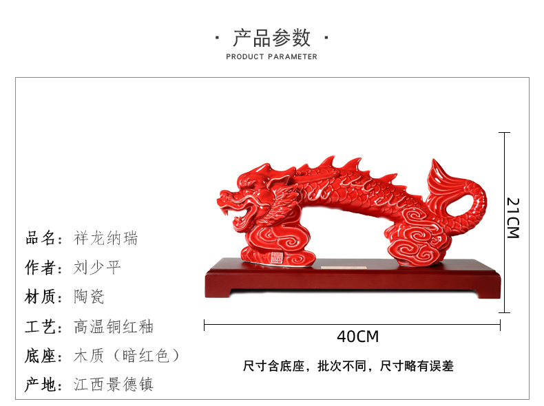 “祥龍納瑞”瓷雕是由首屆中國(guó)陶瓷設(shè)計(jì)藝術(shù)大師劉少平先生根據(jù)民間典故“焦化成龍,獨(dú)占鰲頭”生肖文化元素以象征拼博進(jìn)取的民族精神而象形設(shè)計(jì)創(chuàng)作,寓意我們國(guó)家在中國(guó)共產(chǎn)黨領(lǐng)導(dǎo)下發(fā)奮圖強(qiáng),戰(zhàn)勝各種艱難險(xiǎn)阻,國(guó)家發(fā)展成就舉世矚目,人民安居樂(lè)業(yè)。2024 農(nóng)歷甲辰龍年,愿祥龍納瑞給人們帶來(lái)幸福吉祥,闔家安康。